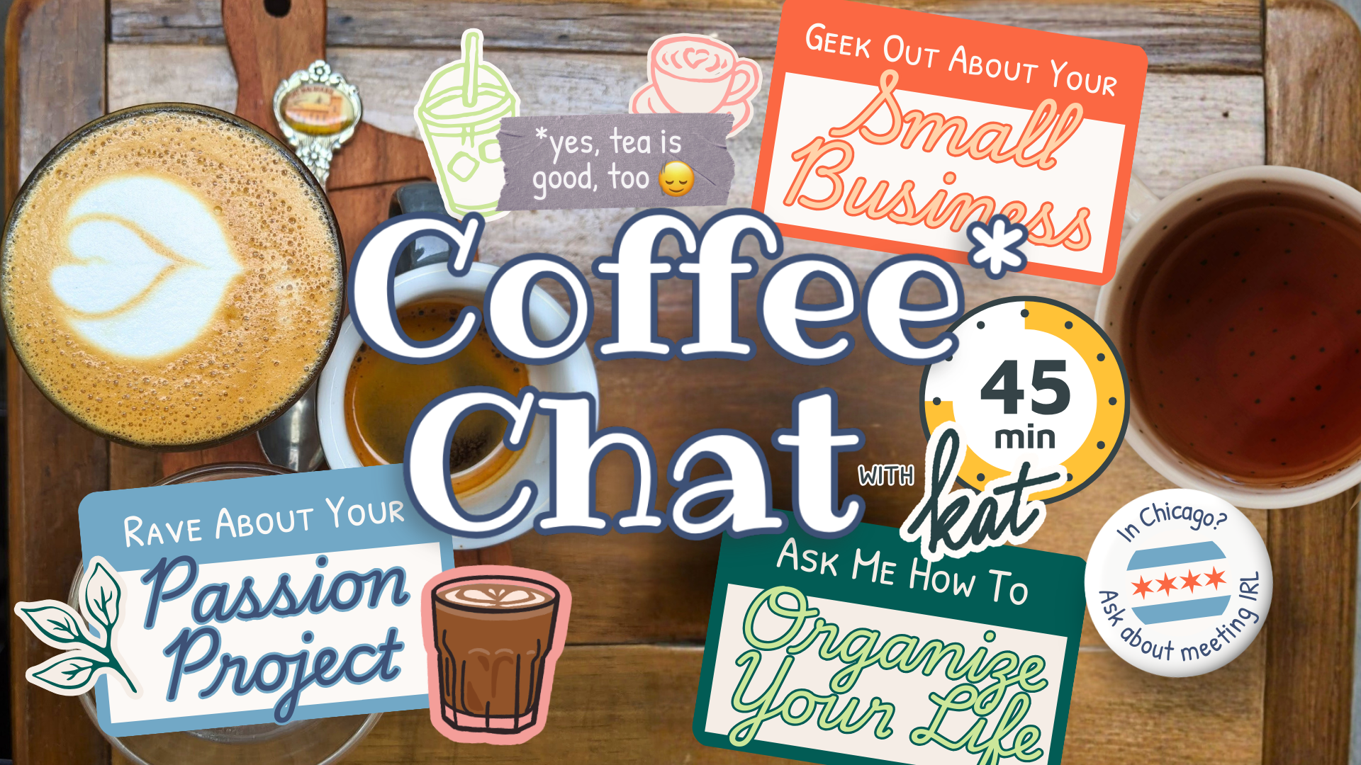 Purchase a Coffee Chat on Buy Me a Coffee to book time with Kat to chat about whatever we want. Geek out about your self-care, passion project, or small business (don't worry, I'll do the same), and let's see how we can help each other!